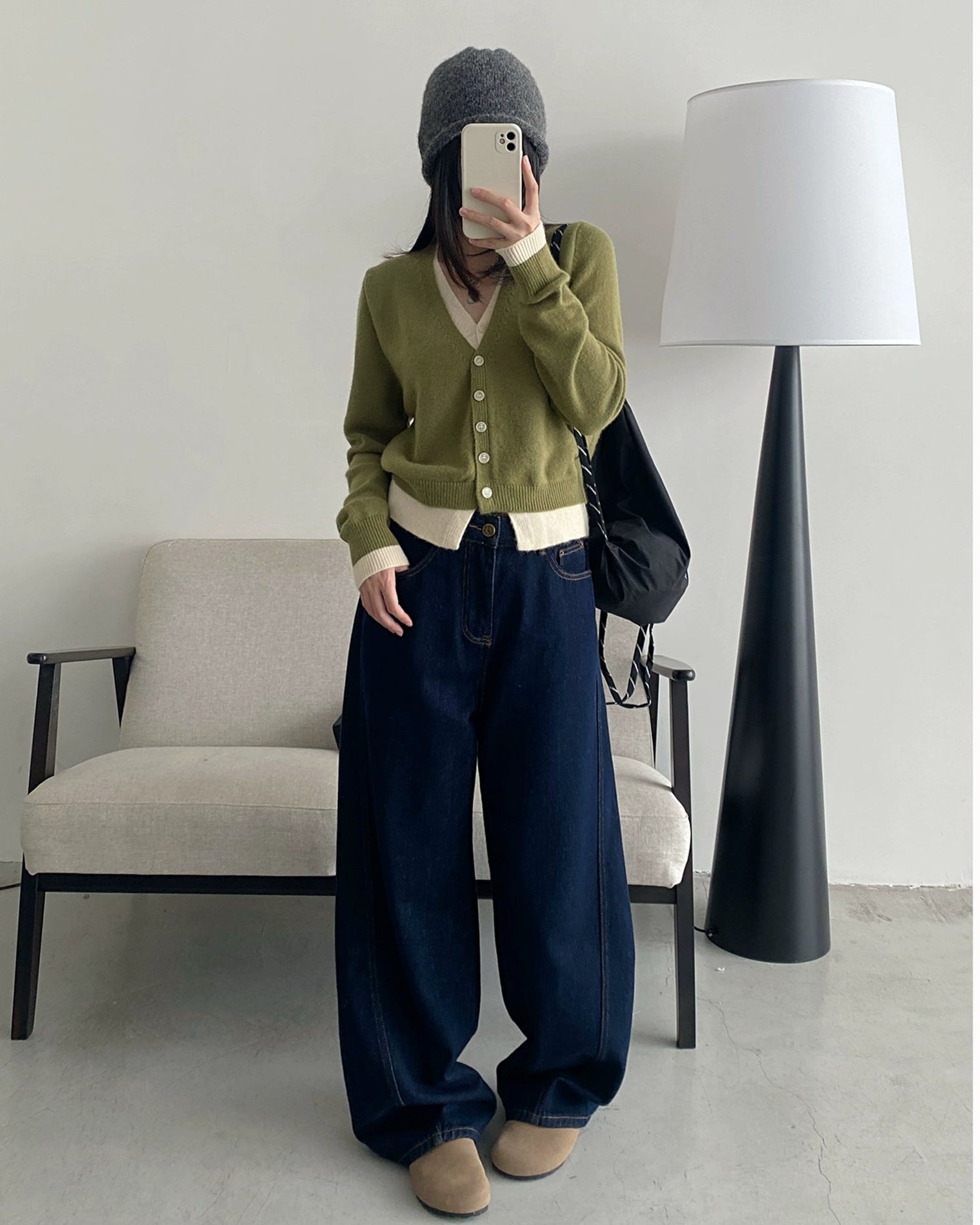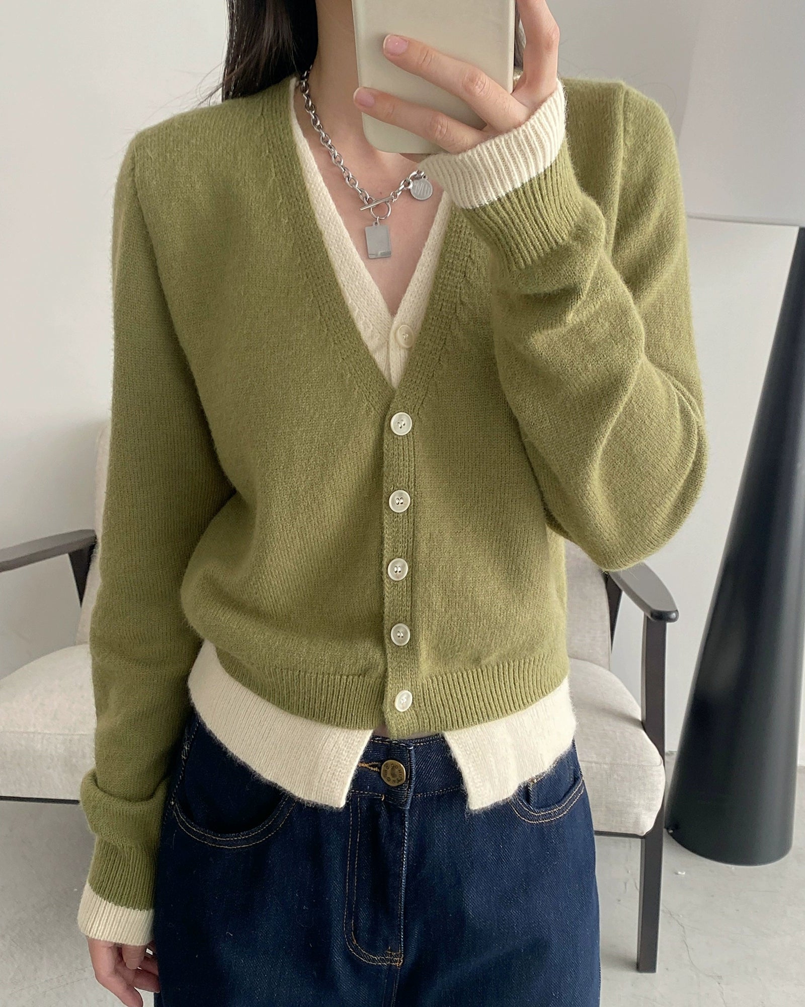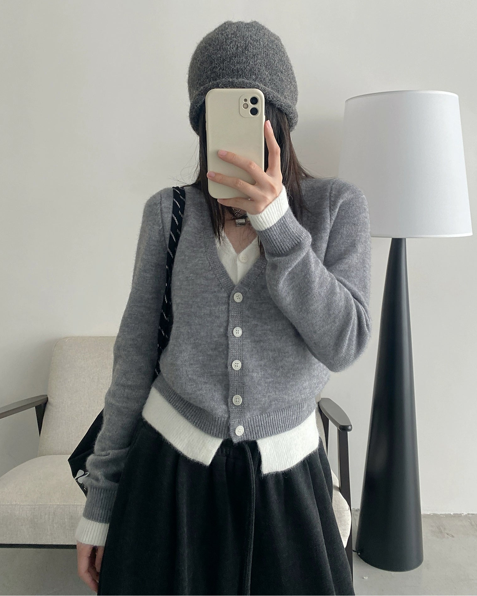 くすみトーンの本体に、襟元・袖口・裾まわりのアイボリーカラーがアクセントになったバイカラーニット。