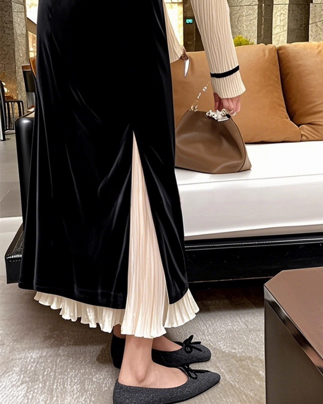 動きのあるプリーツに、ベルベットを組み合わせたオーバーデザイン