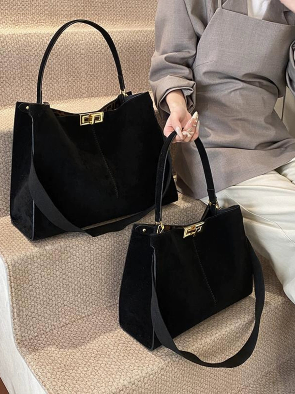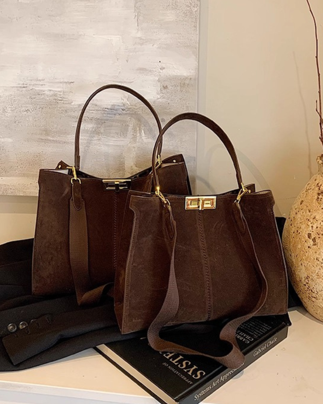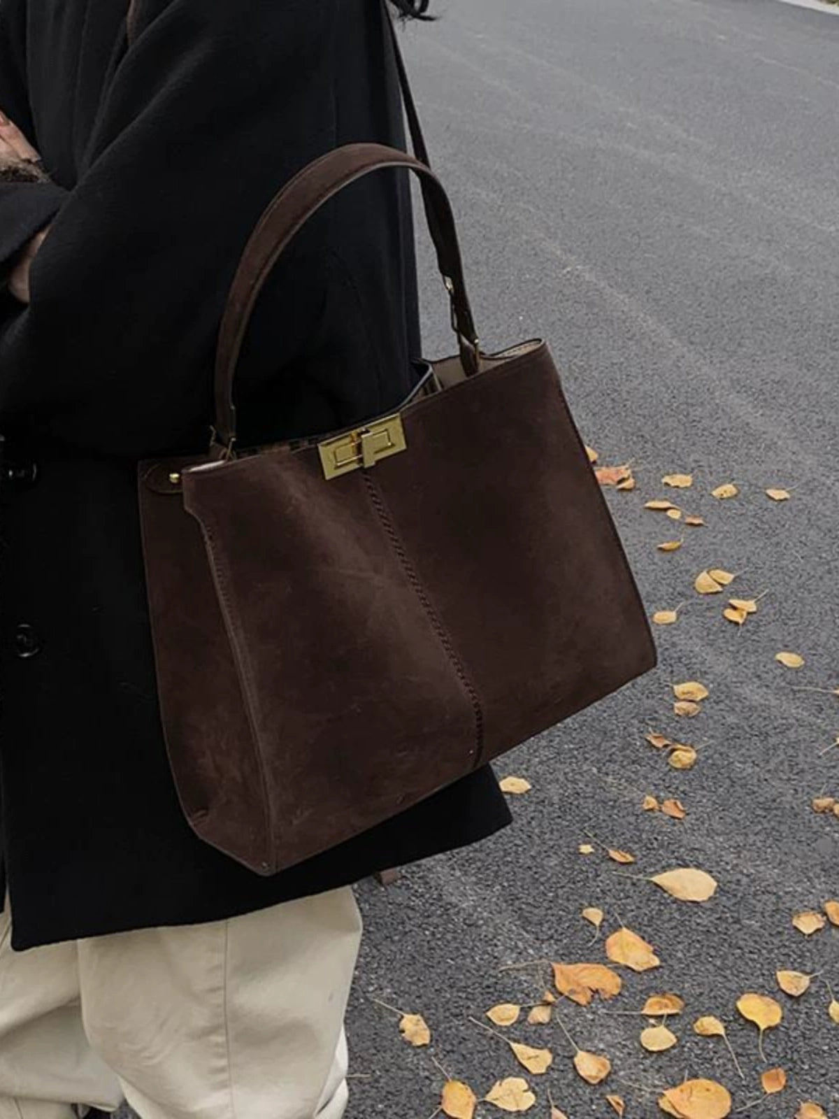 柔らかなスエード調素材にゴールド金具を添えた、クラシカルで上品なハンドバッグ。