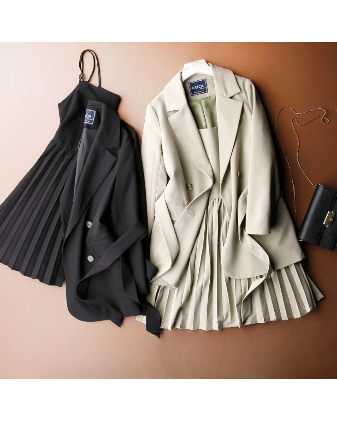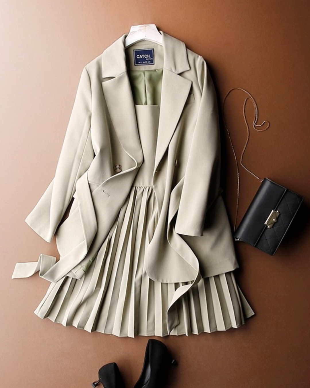 プリーツワンピースとジャケットが一体化した、レイヤード風デザイン。