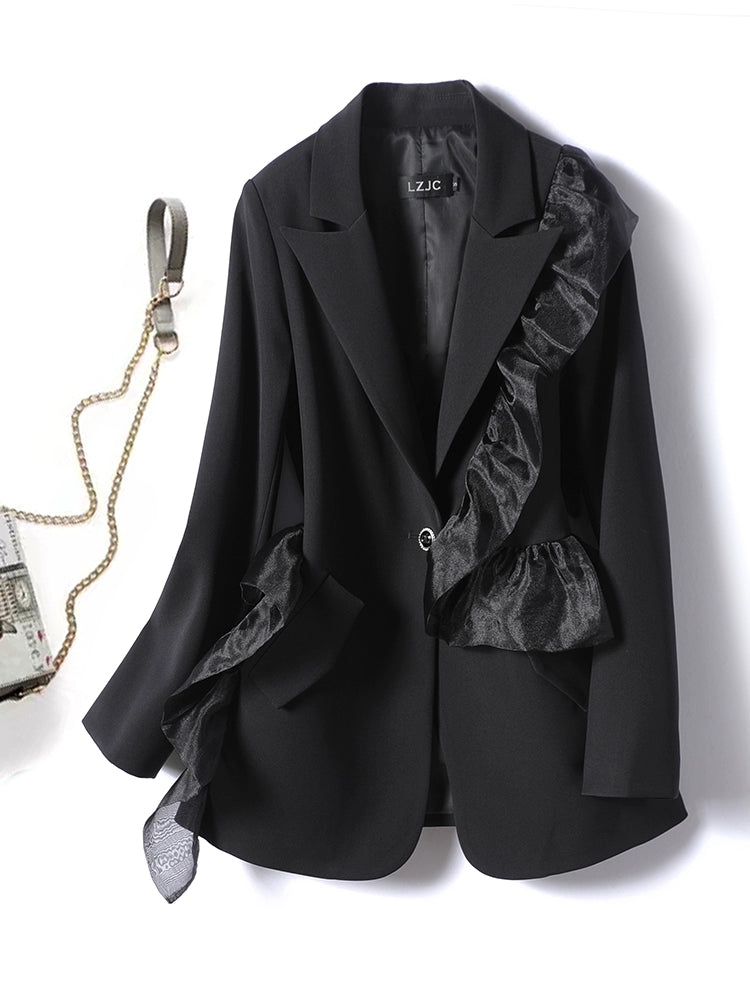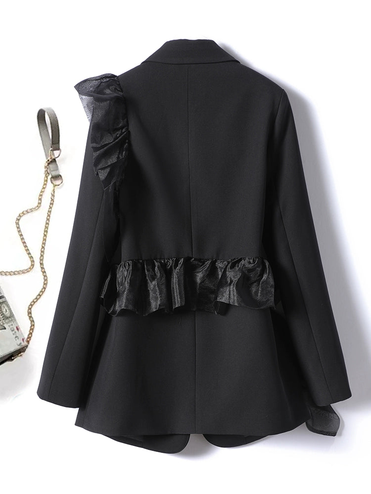 上品なテーラードにサテンフリルをあしらった、華やかでモードなデザインジャケット。
