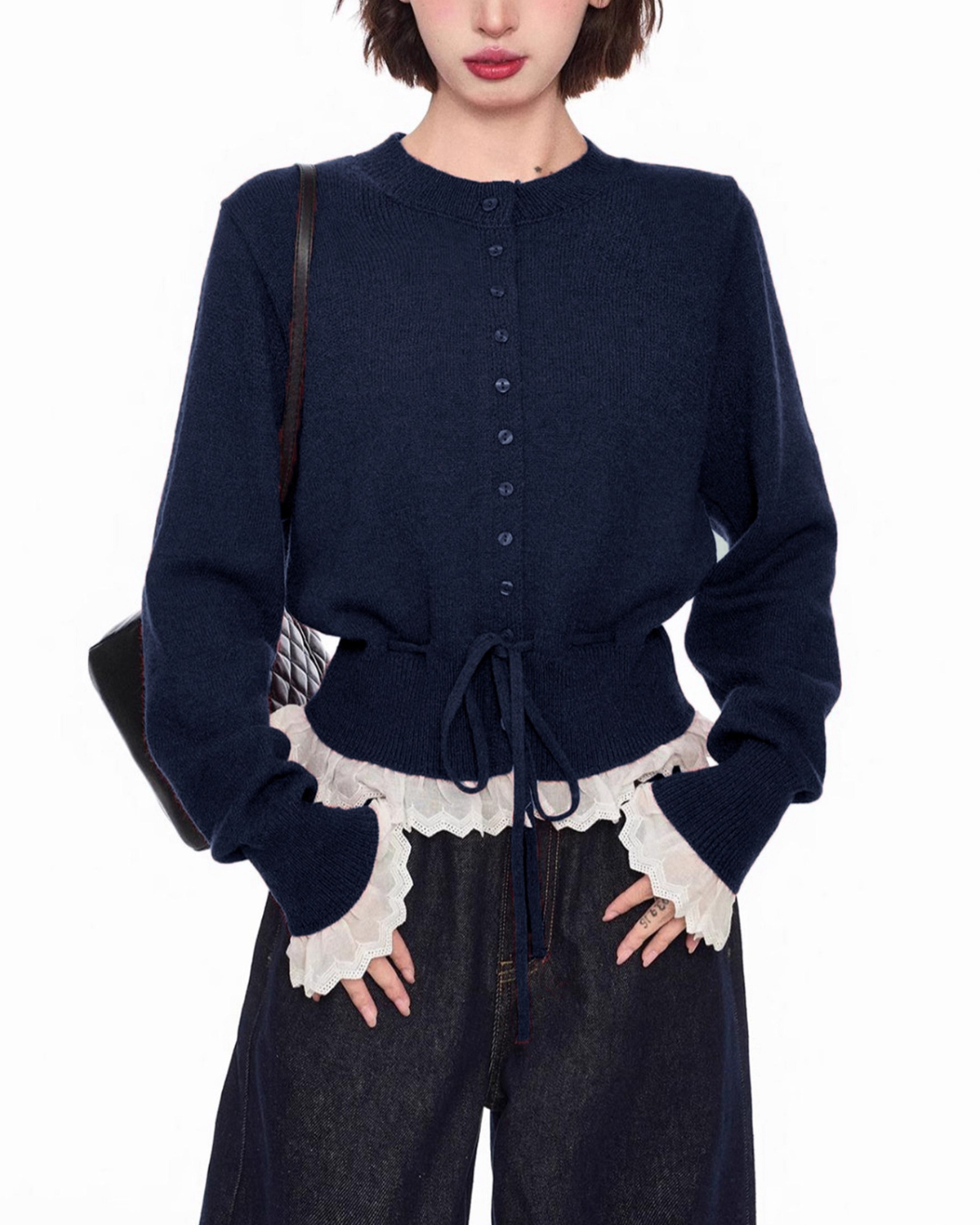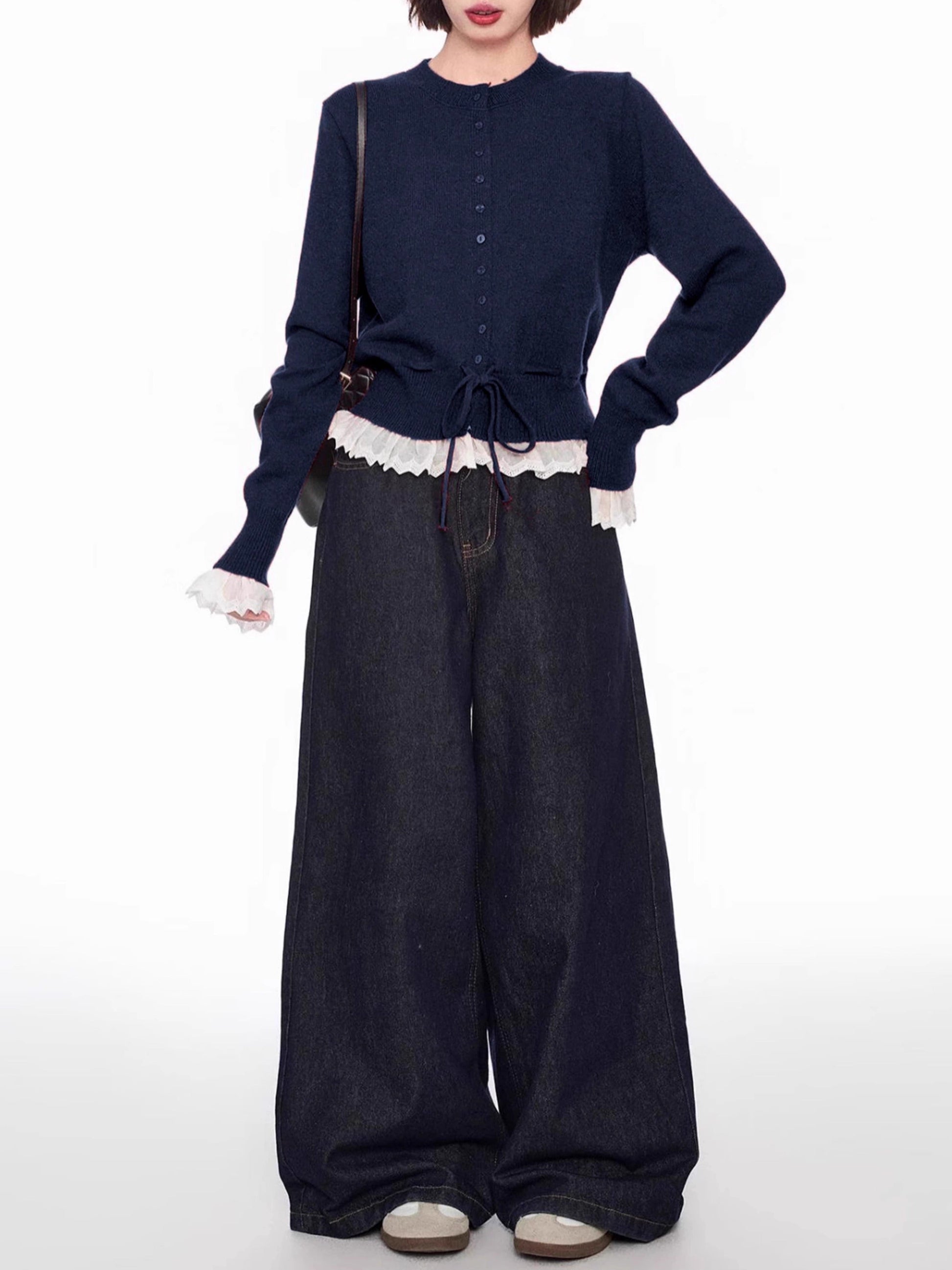 袖口と裾からのぞくレースが、さりげない甘さを添えるニットカーディガン。